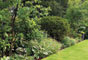 Suburban garden with a clear geometrically angular concept and a structuring plantation with many evergreens such as box-, yew- and pine-trees.