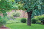 Suburban garden mainly with soft geometric shapes and two wooden decks at different elevations. The plantation is kept rather basic but deciduous trees with different colours of leaves and shaped evergreens characterise the design.